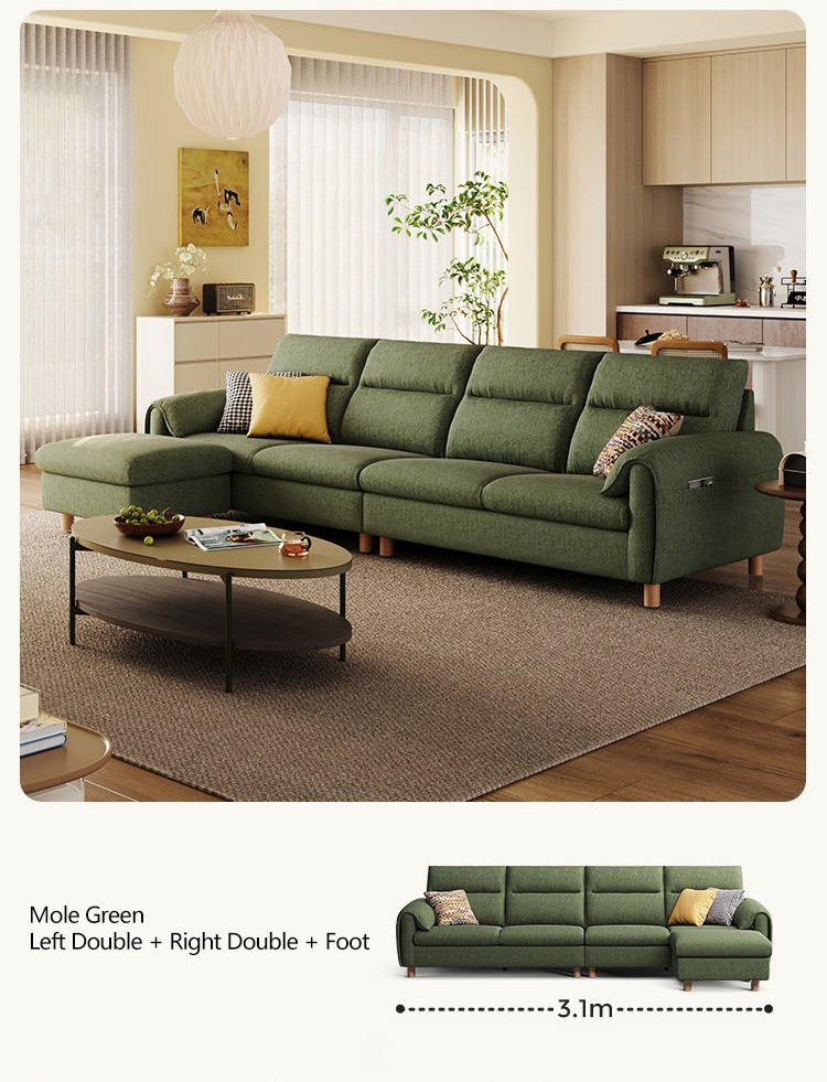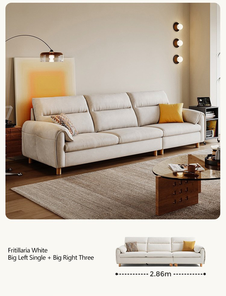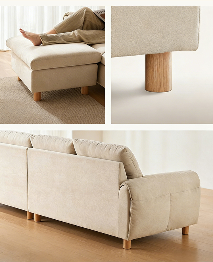 It offers versatile configurations—from a compact 2.1m two-seater to an expansive 3.1m L-shaped sectional—with plush, segmented cushions that invite lounging. The rounded armrests and tapered wooden legs add a soft, organic touch, balancing functionality with understated elegance.
