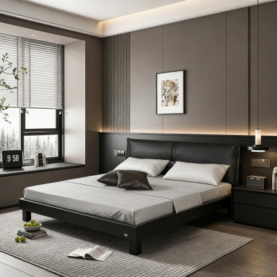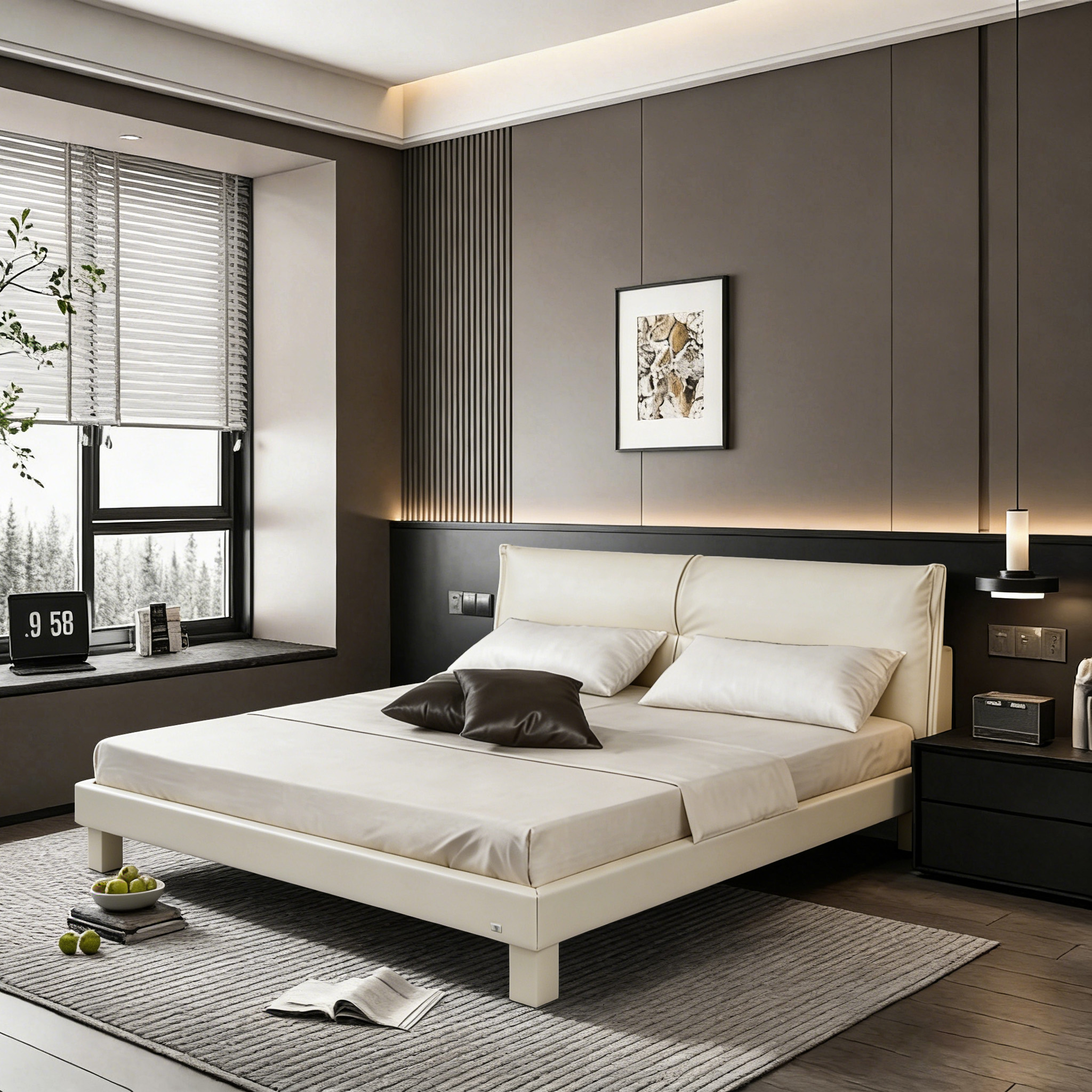 Imported top layer leather is as delicate as baby skin, and the minimalist bed screen design releases more space. The classic color matching of dark brown and black and white, in the light and shadow of the unoccupied lamp, outlines the high-level sense of quiet color, so that every night is immersed in low-key luxury.