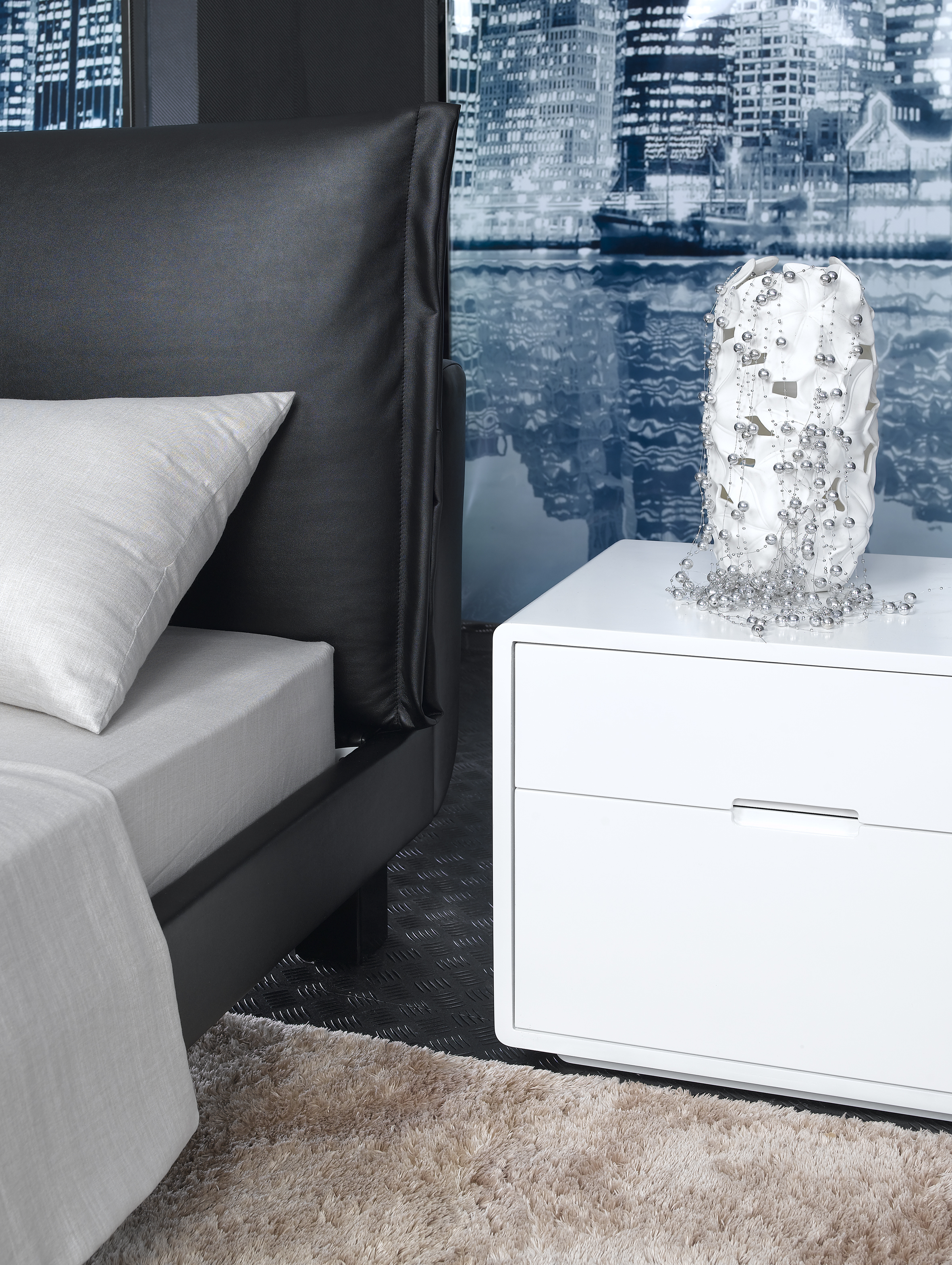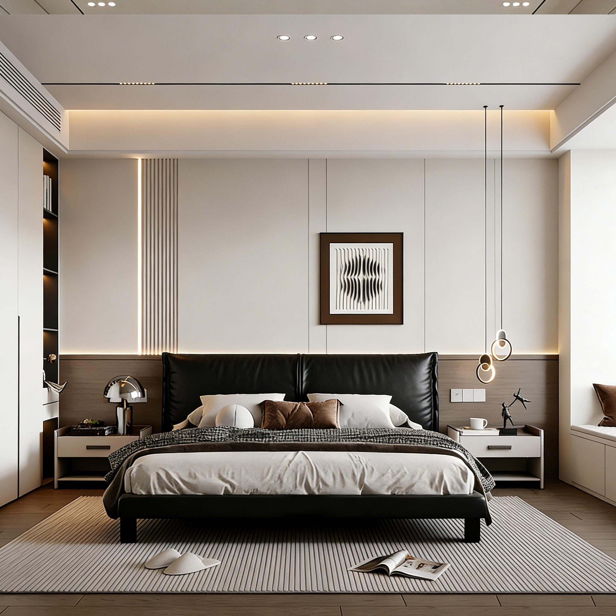 The soft, skin-friendly black leather bed screen infuses a warm wrap in the cool space. With the neat white bedside table, the classic color matching collides with a high-level feeling, making the bedroom the most healing corner in the urban night.