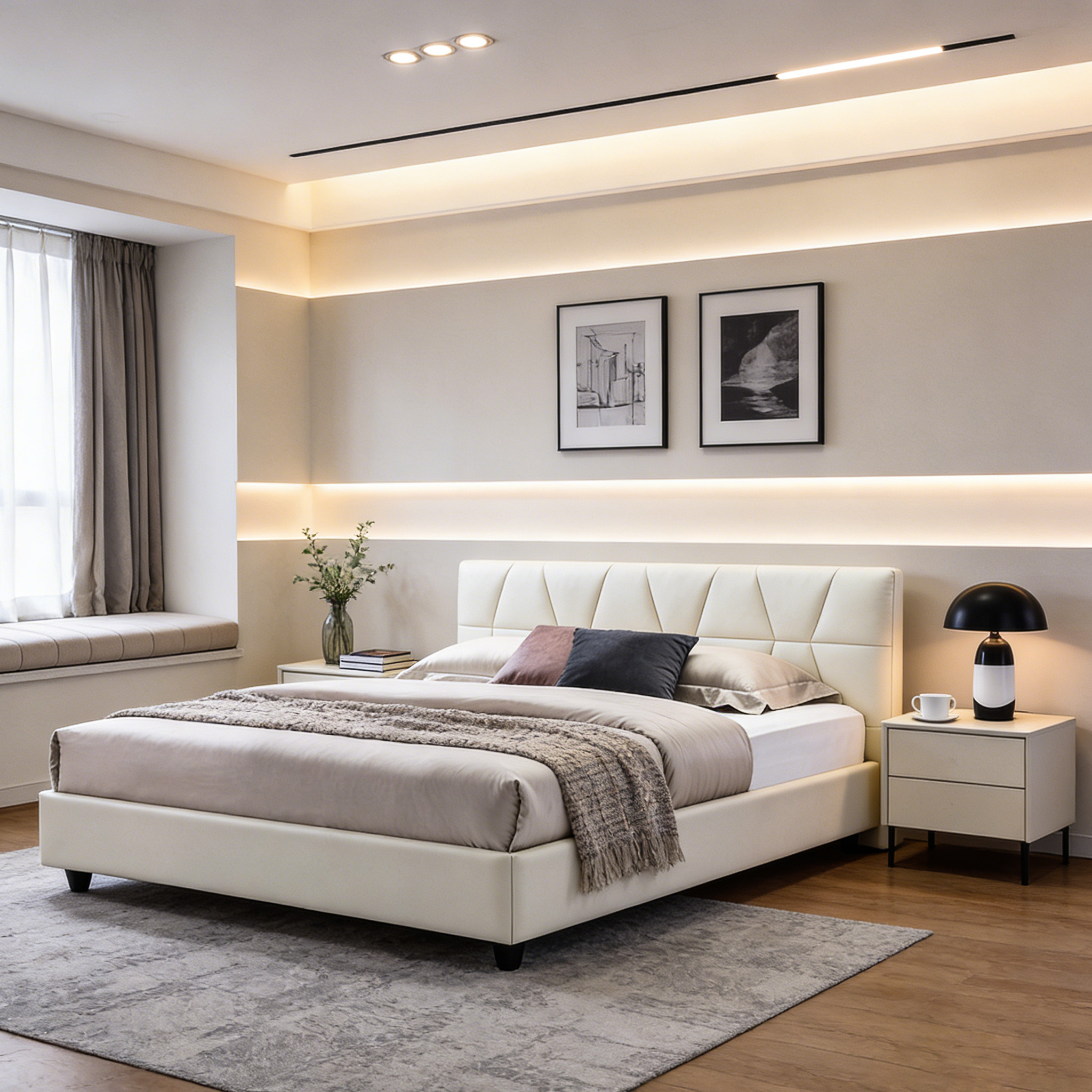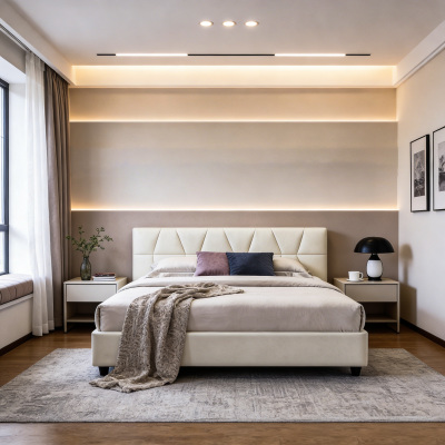 The neat lines of the bed are subtly balanced with the soft, soft bed head, and the light-colored bedding echoes the cold tone of the hanging pictures. No extra decoration, pure material and color matching, let sleep return to essence. When the morning sun is over the curtains, you will understand: a good bedroom never needs to be flattering.
