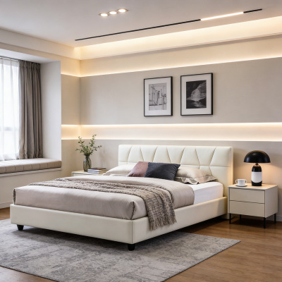 The beige head of the diamond-shaped lattice is like a soft cloud, which firmly holds every night of tossing and turning. Light gray bedding and tassel blankets interweave a gentle level, and warm light atmosphere lights overflow the wall, leaving the whole space immersed in a relaxed atmosphere. Here, unload all tired, embrace the night sweet dream.