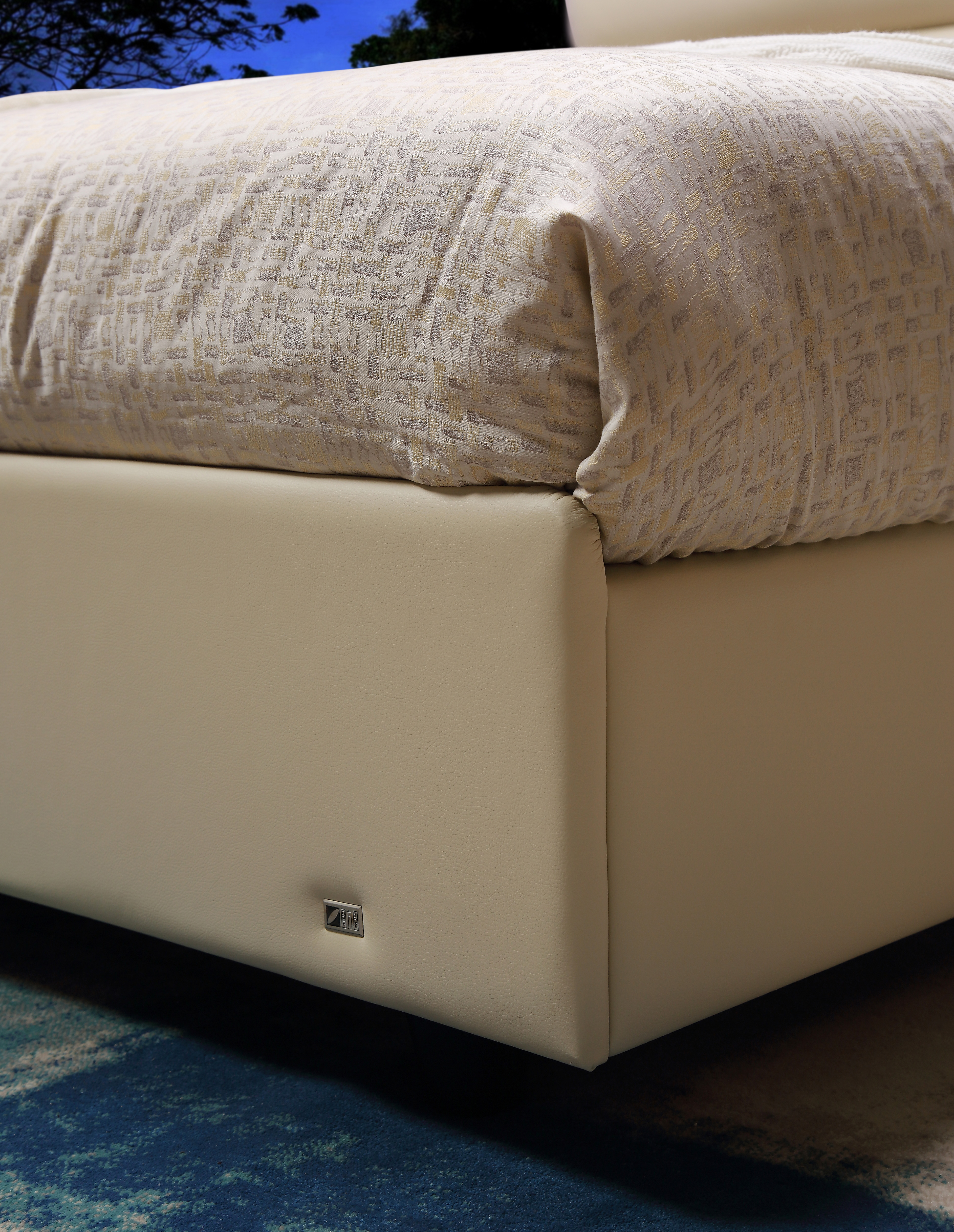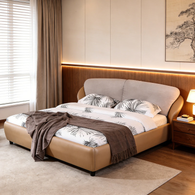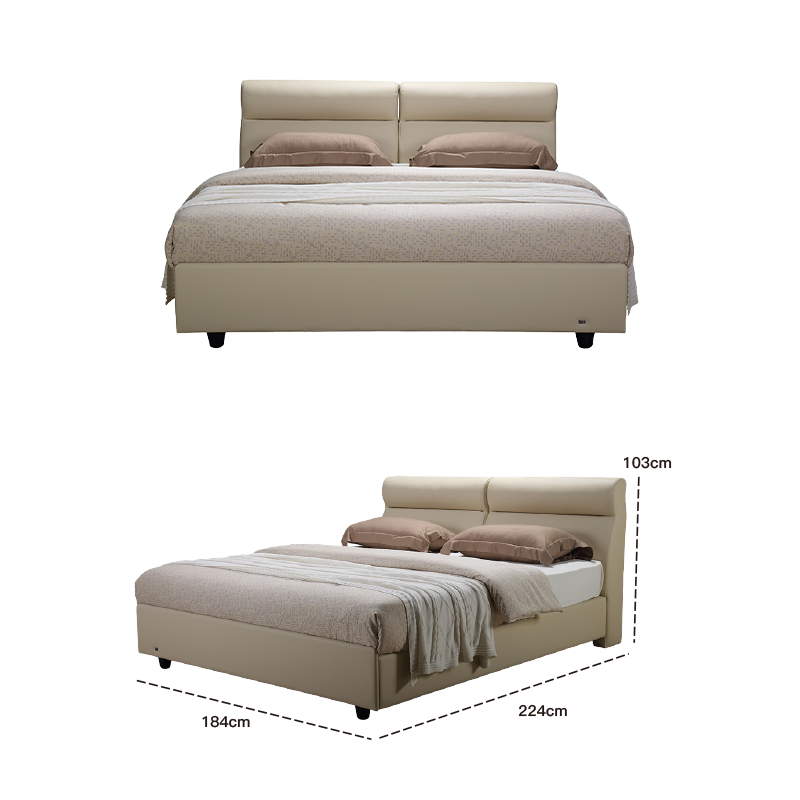 Between the plain texture and the soft rice White, there is a gentle confidence for a good night's sleep. The bed frame is firmly wrapped in fine leather, and the fabric-textured bedding shines in the light.