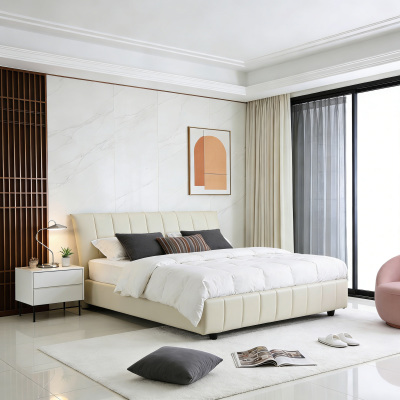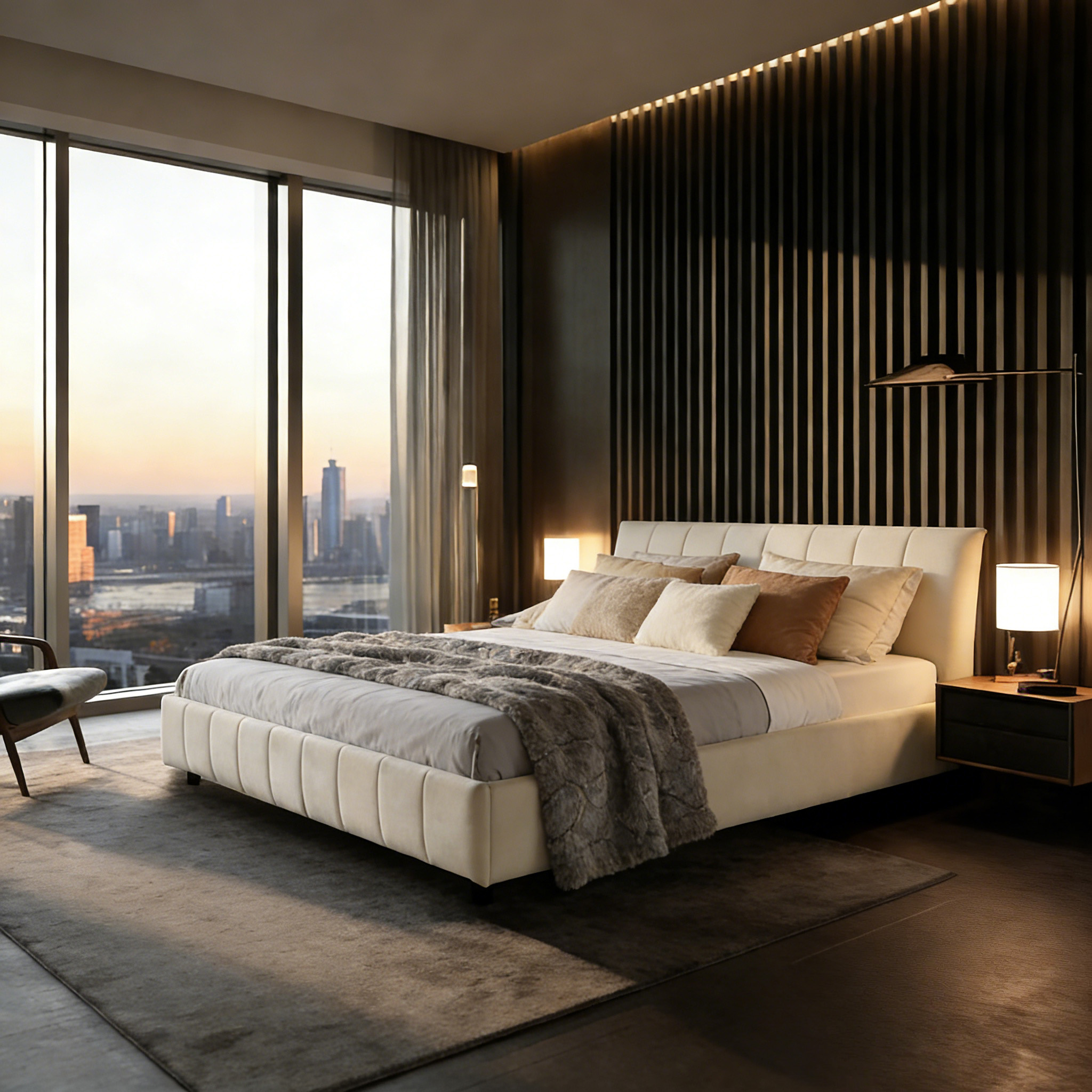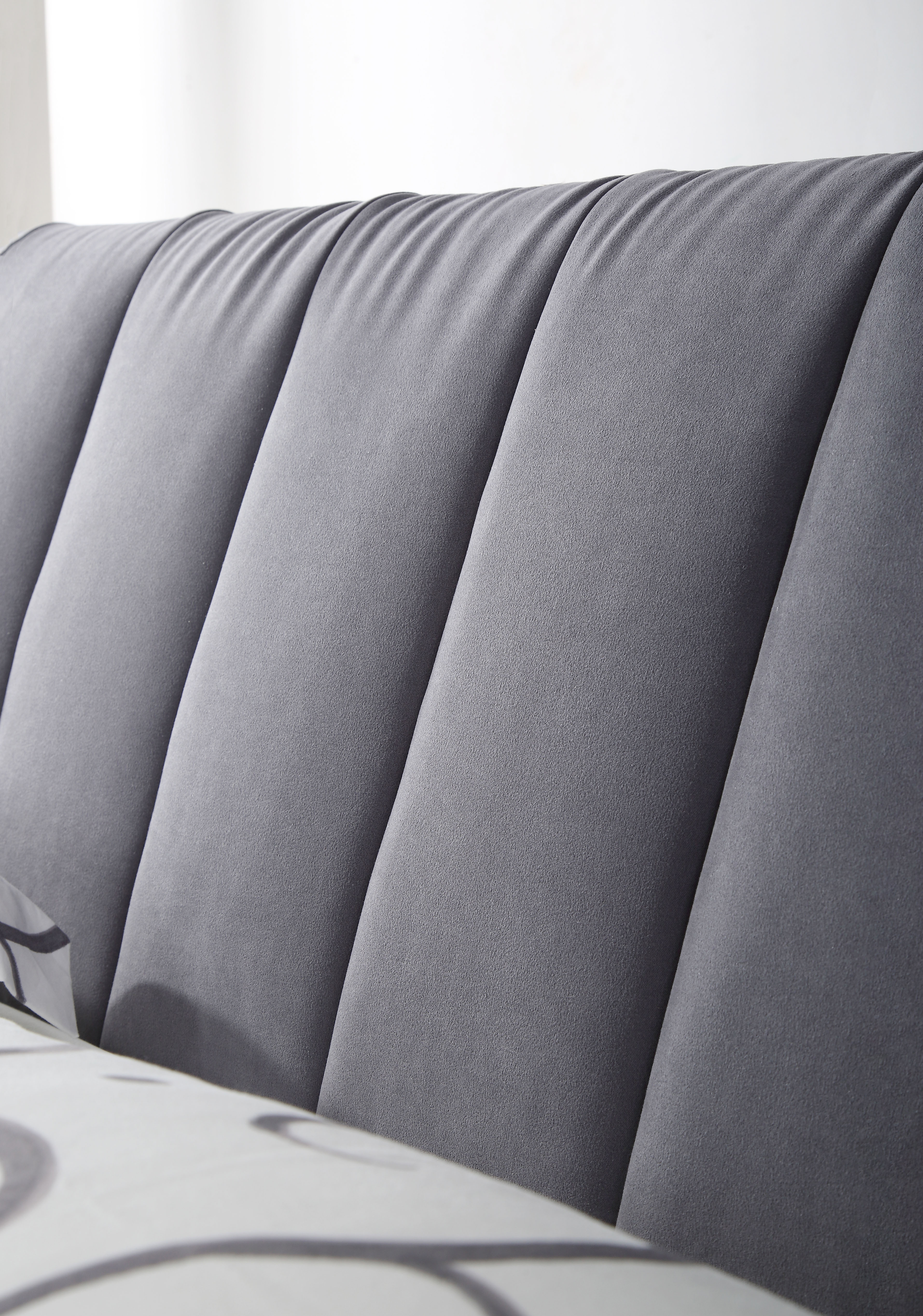 The skin-friendly velvet fabric brings a gentle touch suitable for the Four Seasons. The vertical buckle bedside is not only the visual focus, but also the intimate consideration of ergonomics. The overall design abandons the complicated decoration and uses pure texture and calm tone to create a bedroom corner that can completely relax the body and mind for urbanites.