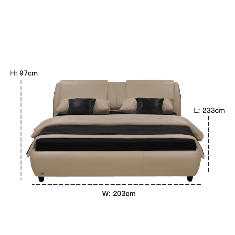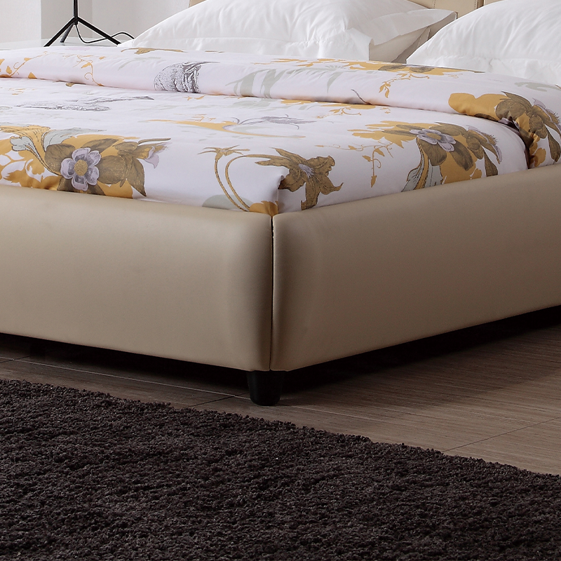 The rounded curved vertical edges on both sides of the head of the bed form an encircling structure with the low bed frame, which is like being gently wrapped, giving people a full sense of security. The minimalist black foot of the bed makes the whole lighter.