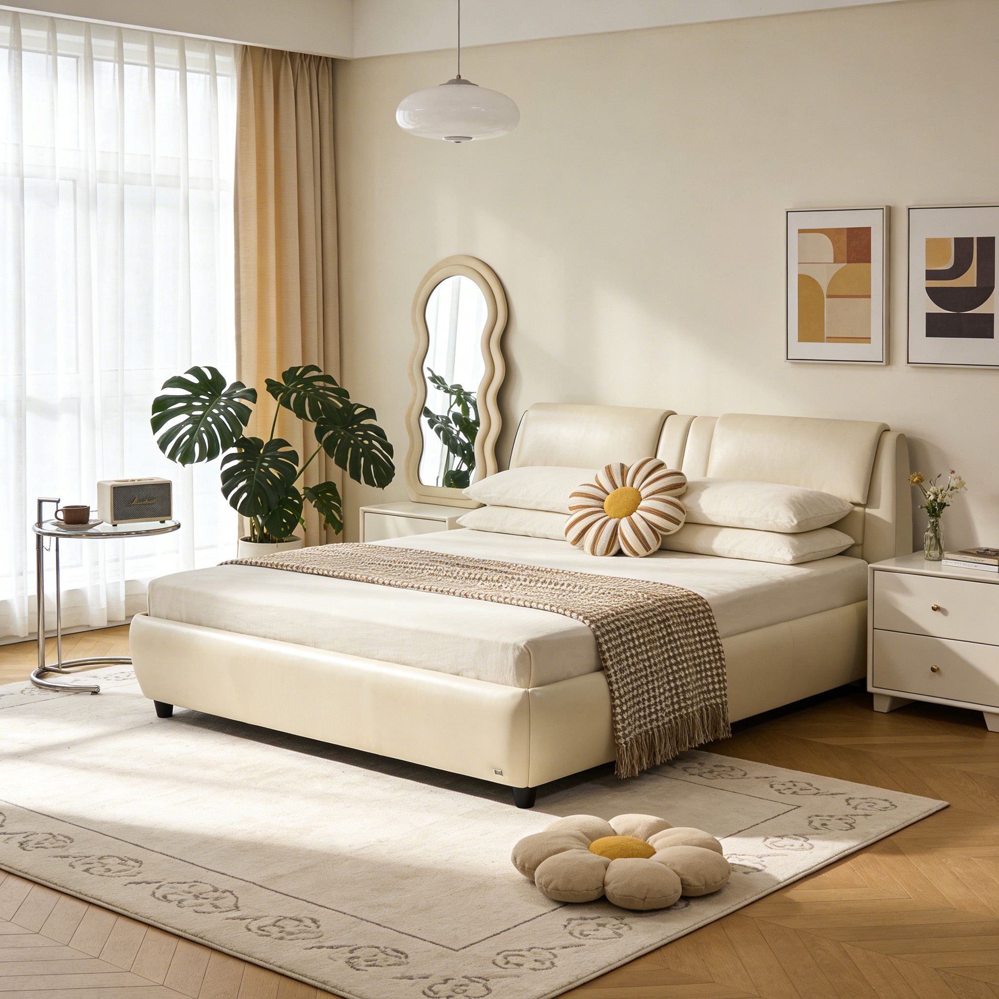 With the rounded arc as the leading factor, from the radian of the bed head to the corners of the bed frame, all weaken the sense of edges and corners, soft but not collapsed.The rice apricot color soft bag bed frame continues the material language of the bed head, and the low visual center of gravity is matched with the slender bed feet, making the space more open.