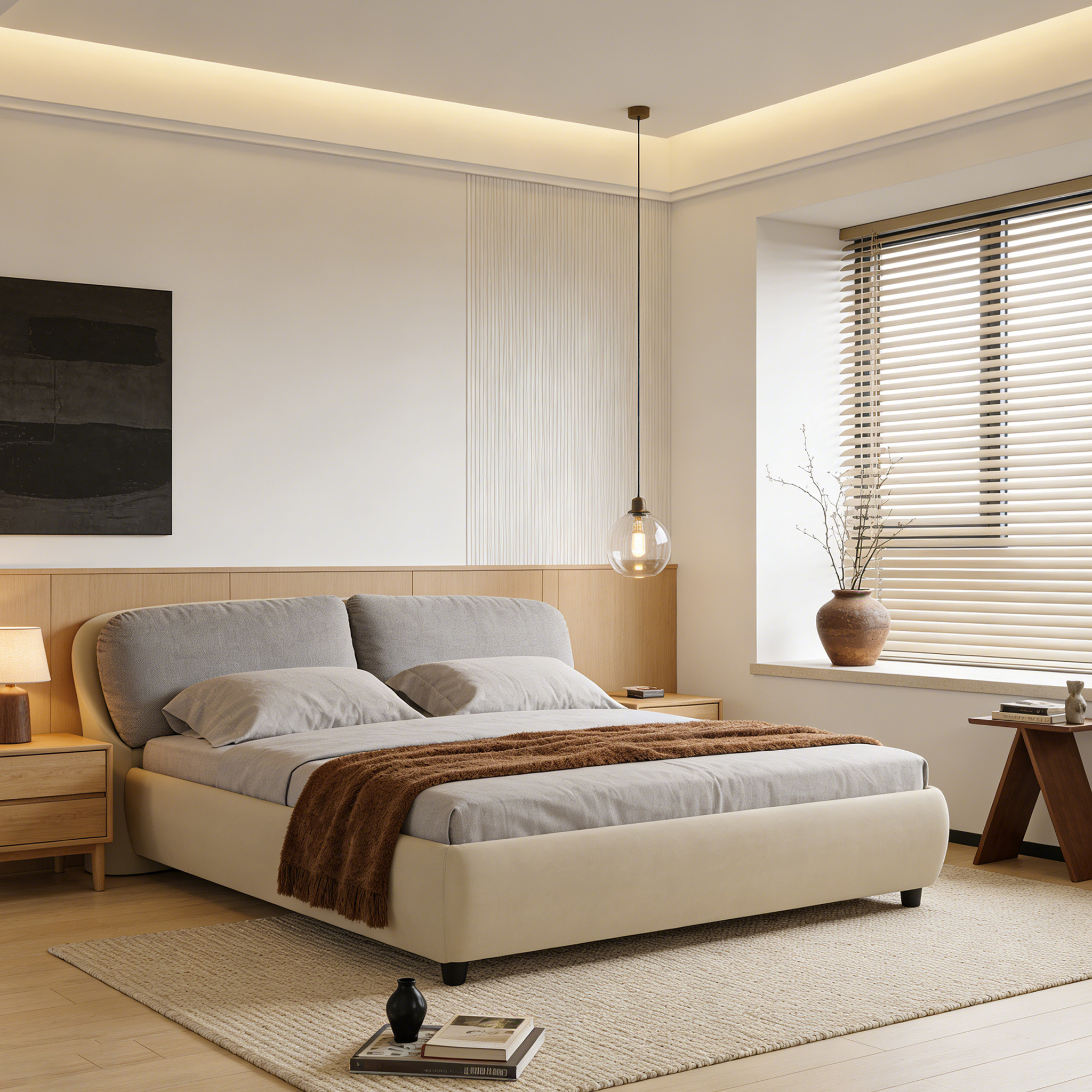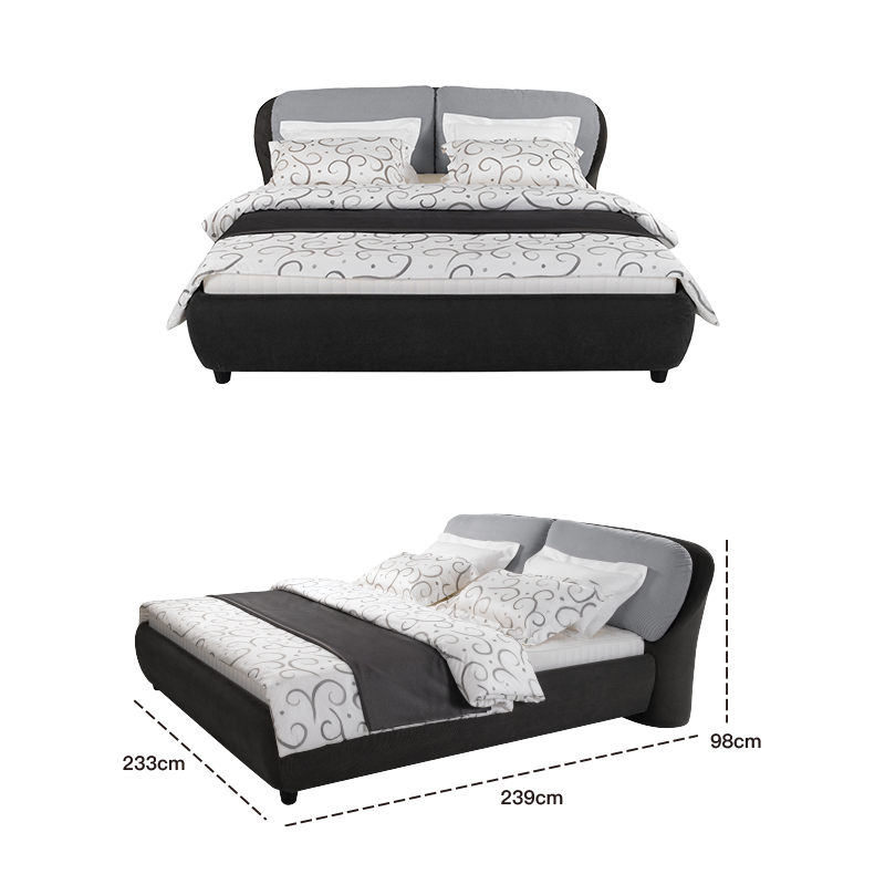 The partition type soft bag bed head design is adopted, which accurately divides the supporting feeling and the wrapping feeling, and fits the different leaning needs of human cervical vertebrae and waist back. The contrast of dark gray and light gray is like the blend of city Twilight and morning fog, showing softness in calmness. The mellow flank lines and the design of low bed legs weaken the sense of space pressure, making the bedroom a healing field with both relaxation and support, creating an exclusive quiet environment for urban people who pursue quality sleep.